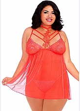 Sale: 39.99 Regular: 95.00 VENICE COLLAR BABY DOLL includes G-STRING (stretch soft lace) ~Mesh with Venetian Lace Applique COLOR: Coral SIZE: 1X ~ 89% Polyester, 11% spandex, 90% nylon