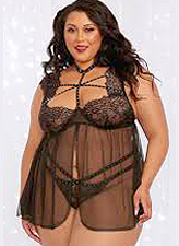 ~Black velvet and eyelash lace babydoll features a flyaway front, a strappy harness overlay with studded details.